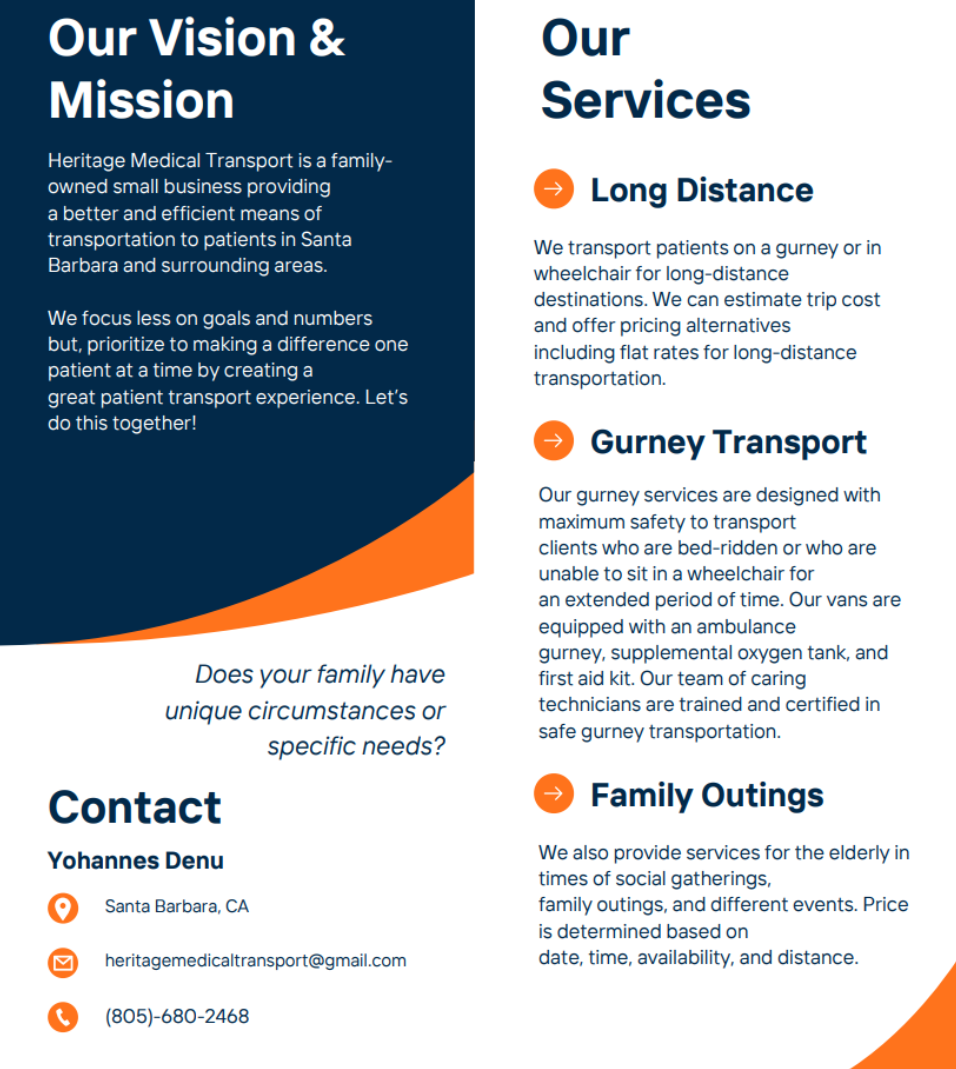 Heritage Medical Transportation is a trusted and dependable provider of non-emergency medical transportation services. We specialize in wheelchair transportation, dialysis appointments, doctor visits, cancer treatment center trips, family outings, and other medical-related travel needs. Serving Santa Barbara, Montecito, and surrounding counties, the company is committed to creating a comfortable and compassionate experience for every passenger.